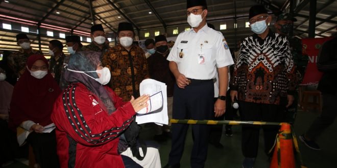 Jakarta (10/9). Gubernur Anies Baswedan mengapresiasi penyelenggaraan vaksinasi massal di Padepokan Persinas ASAD Ponpes Minhaajurrosyidiin yang merupakan kerja sama antara LDII (Lembaga Dakwah Islam Indonesia), Ponpes Minhaajurrosyiddin Pondok Gede, dan Puskesmas Cipayung Jakarta Timur.