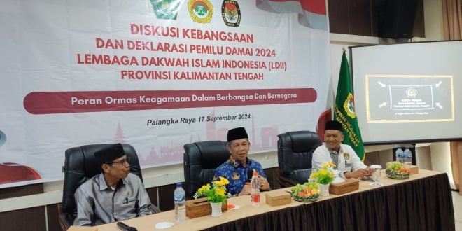 PALANGKA RAYA – Kepala Bagian Tata Usaha Kanwil Kemenag Kalimantan Tengah, Tuani, memberikan materi dalam kegiatan Diskusi Kebangsaan dan Deklarasi Pemilu Damai 2024 yang diselenggarakan oleh Lembaga Dakwah Islam Indonesia (LDII) Provinsi Kalimantan Tengah, Selasa, 18 September 2024.